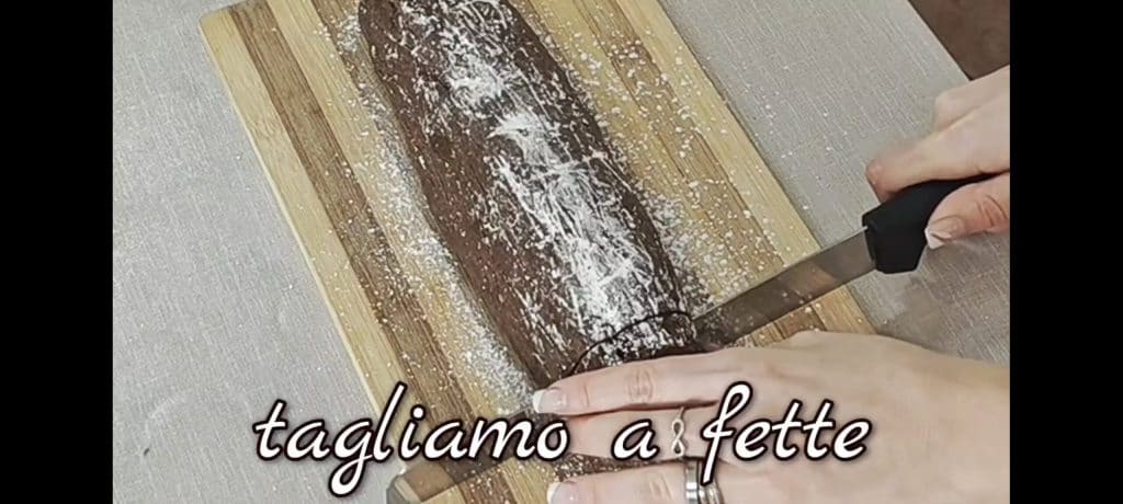 • Colocamos a mistura obtida sobre o filme plástico e moldamos para obter um rolo compacto. Fechamos bem o filme apertando as extremidades e colocamos na geladeira por algumas horas. Depois de algumas horas, removemos o filme plástico, colocamos um pouco de açúcar de confeiteiro por cima