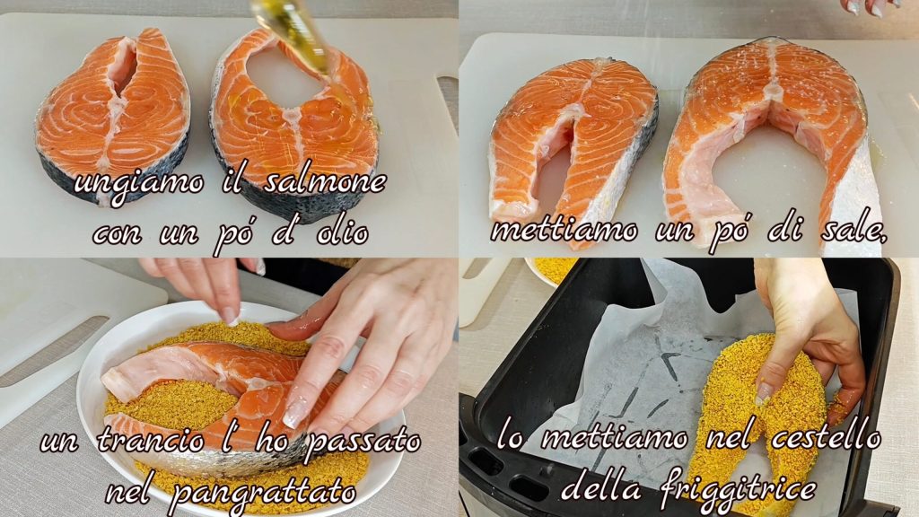 Passamos um pouco de azeite nos pedaços de salmão, colocamos um pouco de sal em cima e massageamos delicadamente. Pegamos o primeiro pedaço e passamos na farinha de rosca e depois o colocamos na cesta da fritadeira elétrica.