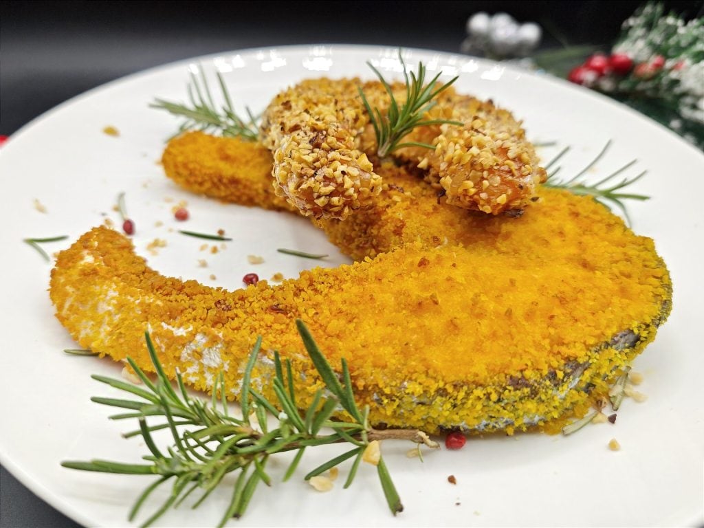 Pegamos o segundo pedaço e passamos na farofa de avelãs. Colocamos na cesta da fritadeira. Adicionamos um fio de azeite por cima e cozinhamos a 190º por cerca de 20 minutos.
