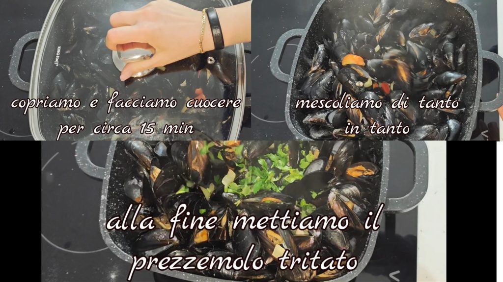 • Cobrimos e deixamos cozinhar por cerca de 10/15 min mexendo de vez em quando (os mexilhões devem abrir). No final adicionamos a salsinha fresca picada. Bom apetite!