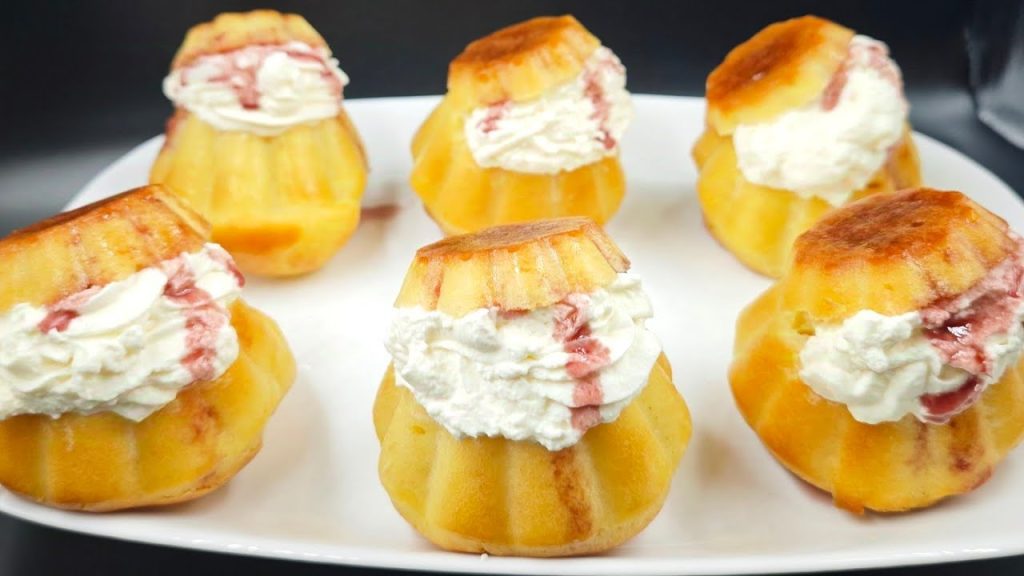 • Pegamos as savarine cozidas e resfriadas e cortamos a base deixando apenas um pedaço preso (veja o vídeo AQUI). Mergulhamos na calda preparada anteriormente. Esperamos alguns minutos para absorver bem a calda e depois recheamos com chantilly.