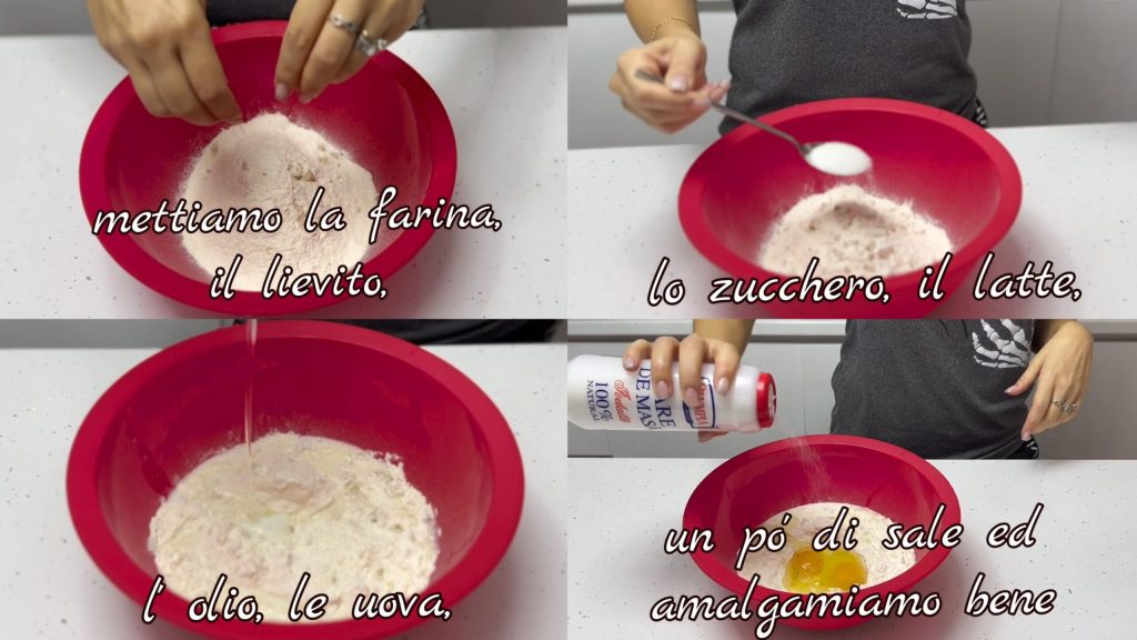 Colocamos a farinha, o fermento, o açúcar, o leite, o óleo, os ovos, um pouco de sal e misturamos bem com uma colher por alguns minutos.