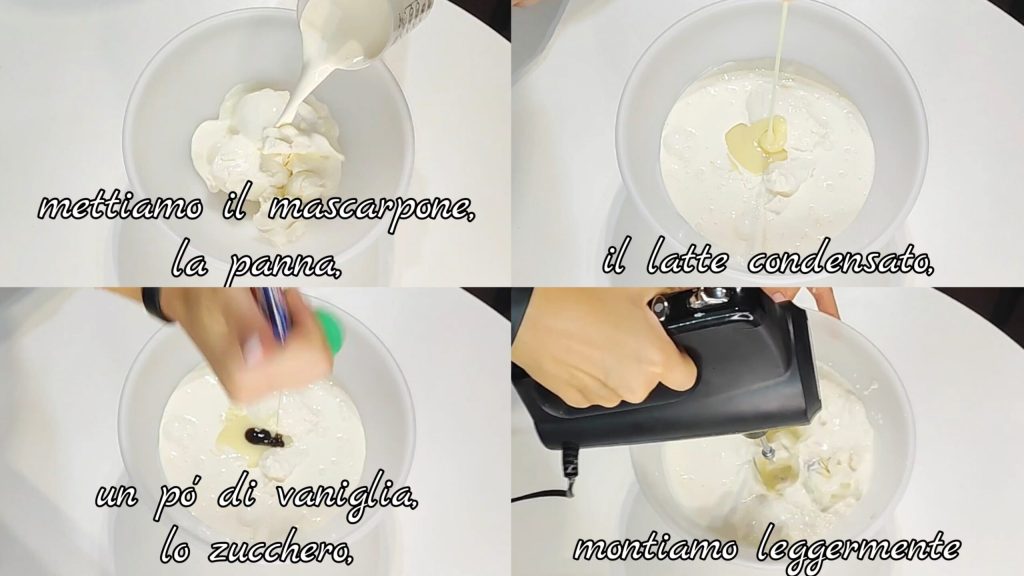 Em um recipiente, colocamos o mascarpone, o creme de leite, o leite condensado, um pouco de baunilha, o açúcar e batemos levemente com a batedeira elétrica.