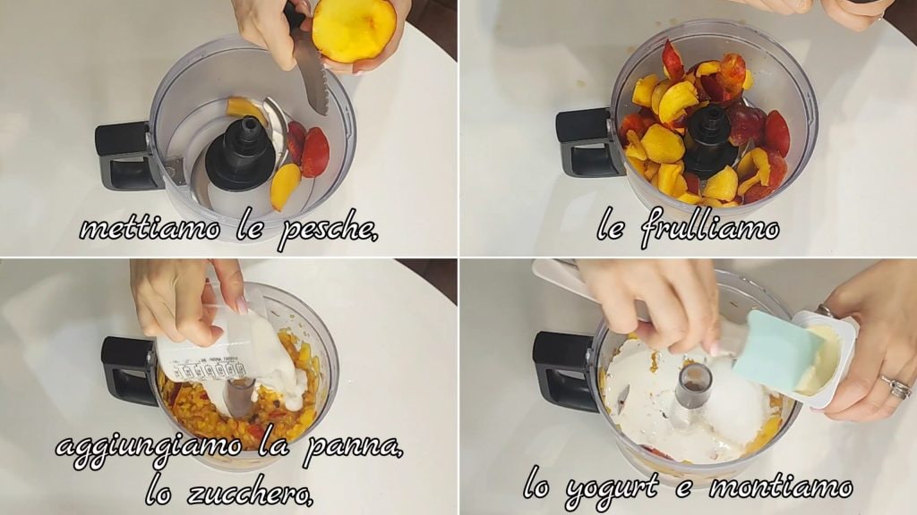 No liquidificador, colocamos os pêssegos lavados e cortados e os batemos. Adicionamos o creme, o açúcar, o iogurte e batemos ligeiramente.