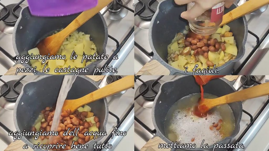 Adicionamos as batatas cortadas em pedaços e as castanhas já limpas. Colocamos também os feijões escorridos, depois cobrimos com água. Adicionamos o purê,