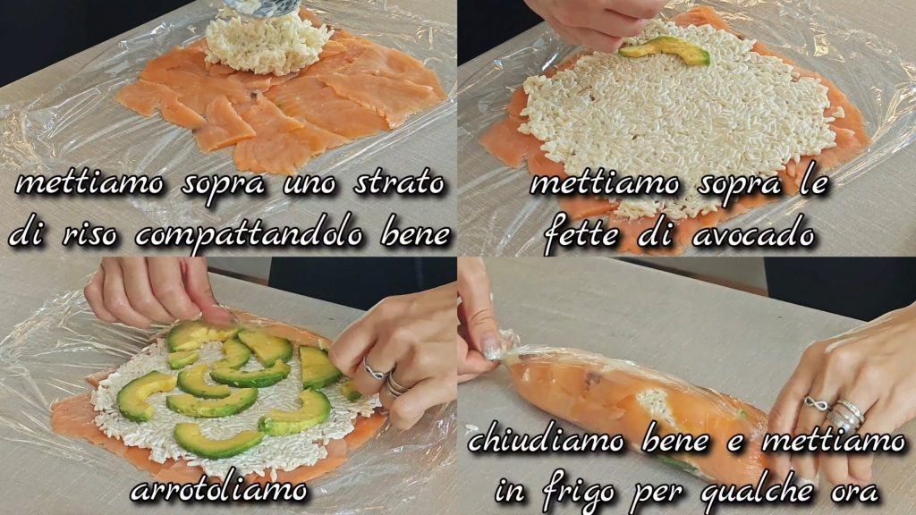 Primeiro, limpamos o abacate e o cortamos em fatias finas. Misturamos o arroz cozido e frio com o queijo cremoso. Colocamos as fatias de salmão defumado em linha sobre o filme plástico.