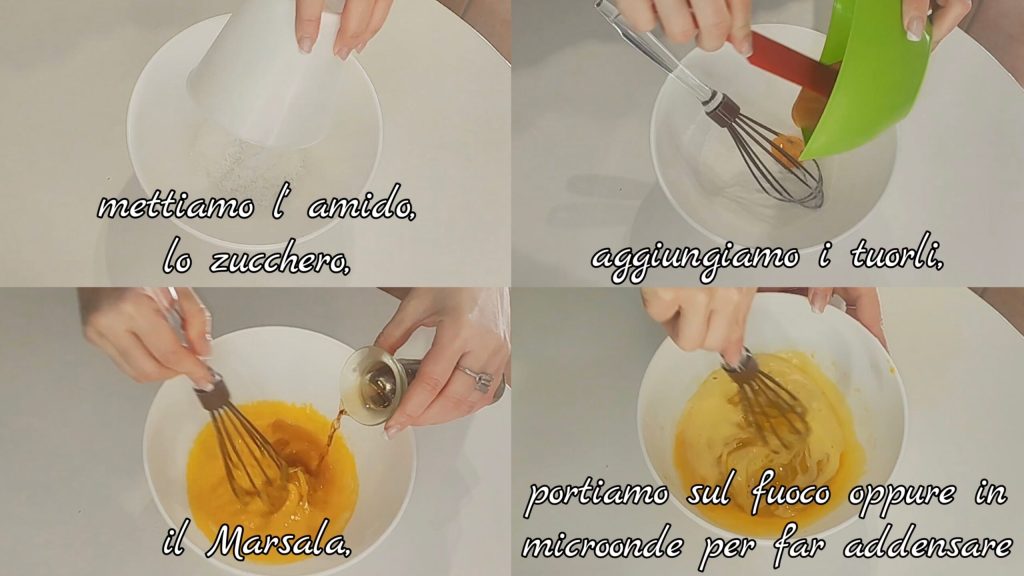 Primeiro, devemos preparar o zabaione: Em um recipiente, colocamos o amido, o açúcar, as gemas, o Marsala e levamos ao fogo ou ao micro-ondas para engrossar (mexendo).