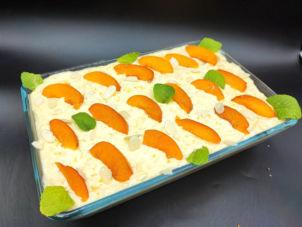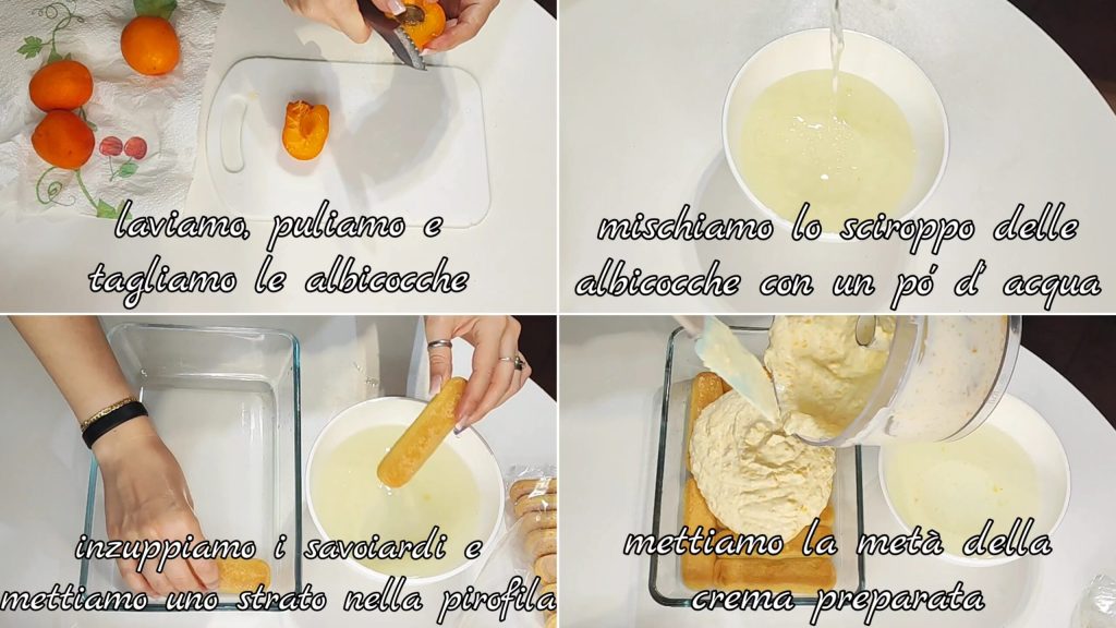 Lavamos, limpamos e cortamos os damascos frescos. Misturamos a calda dos damascos com um pouco de água e embebemos os biscoitos champagne, depois os colocamos em fila na travessa. Adicionamos metade do creme preparado por cima.
