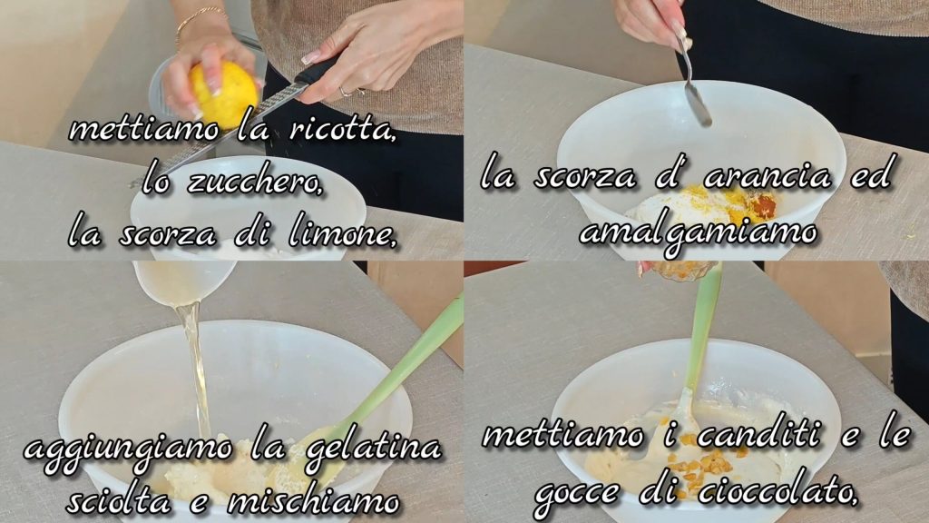 • Em uma tigela, colocamos a ricota, o açúcar, as raspas de limão, as raspas de laranja e misturamos. Adicionamos a gelatina dissolvida e misturamos bem. Colocamos as frutas cristalizadas e as gotas de chocolate a gosto.