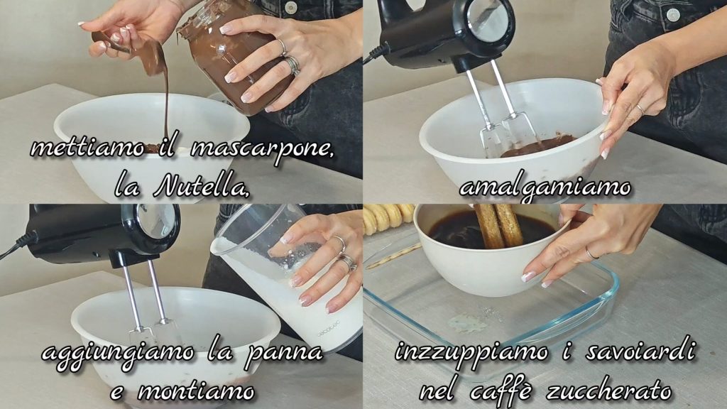 Em uma vasilha coloque o mascarpone, a Nutella e misture. Adicione o creme de leite e bata. Molhe os biscoitos tipo champanhe no café adoçado