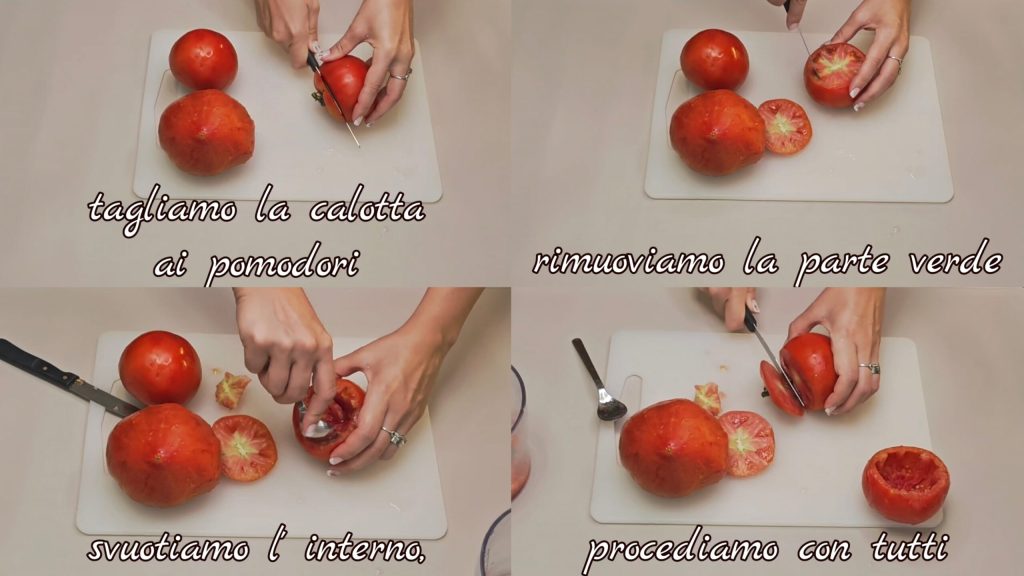 Primeiro, lavamos bem os tomates, depois cortamos as tampas, removemos a parte verde dura e então esvaziamos o interior.
