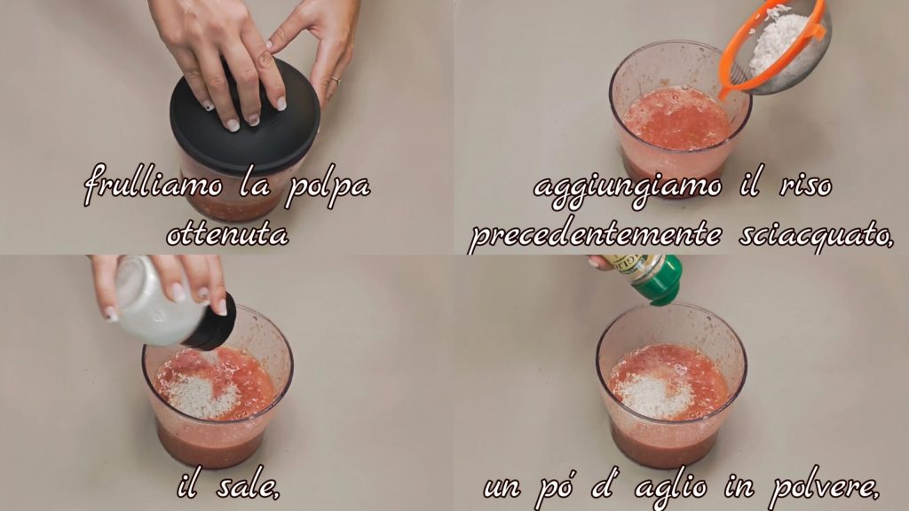 Bater a polpa obtida no liquidificador. Adicionamos o arroz previamente enxaguado, o sal, um pouco de alho em pó e misturamos.