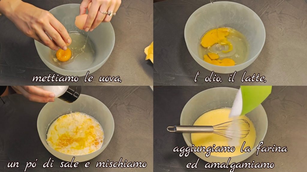 Colocamos os ovos, o óleo, o leite, um pouco de sal e misturamos. Adicionamos a farinha e mexemos para evitar a formação de grumos.