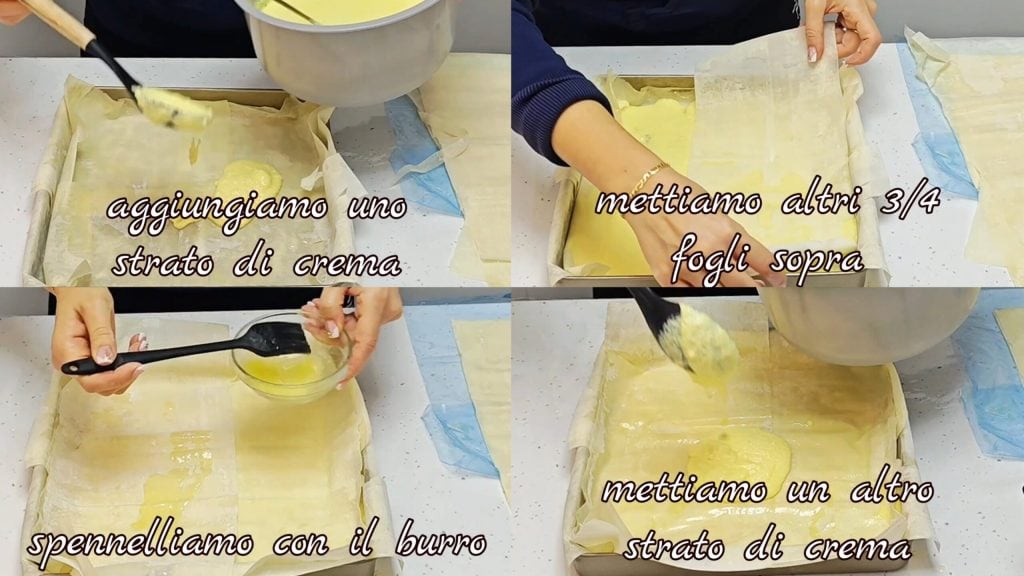 depois acrescente um pouco de creme, mais 3/4 folhas de massa filo, pincele com a manteiga, outra camada de creme