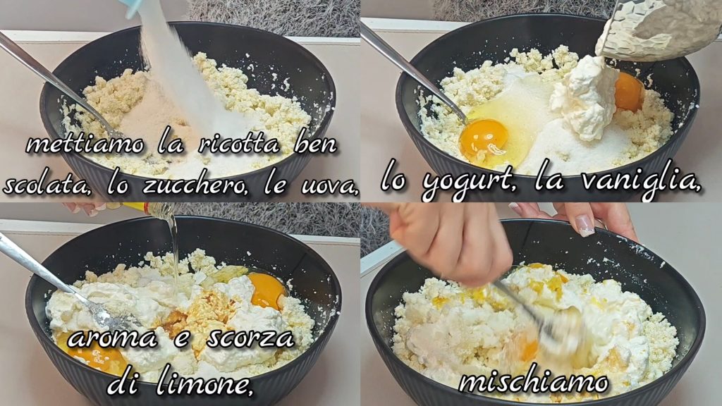 Em uma tigela colocamos a ricota bem escorrida, o açúcar, os ovos, o iogurte, a baunilha, aroma e raspas de limão e misturamos.
