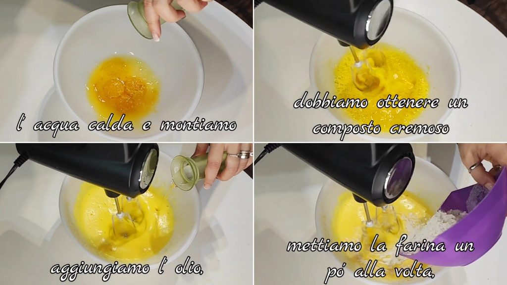 Adicionamos a água quente e batemos. Precisamos obter um composto cremoso claro. Adicionamos o óleo, a farinha aos poucos.