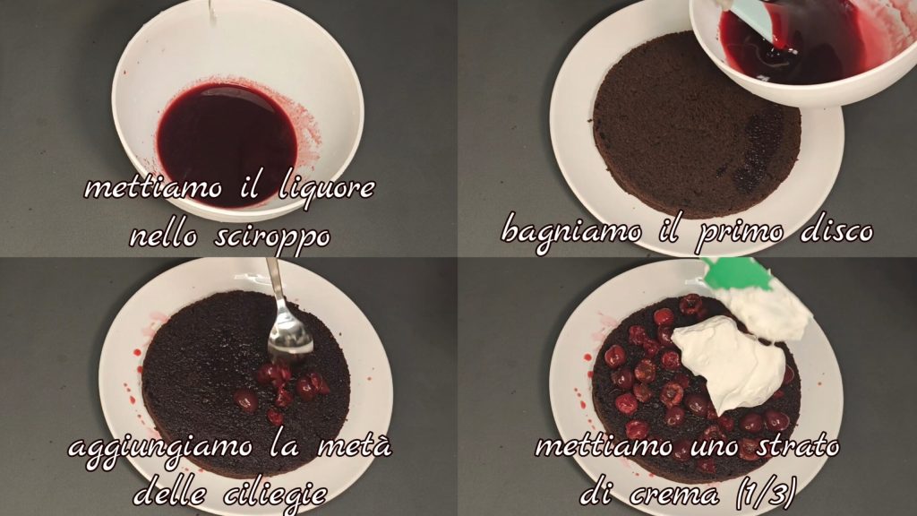 Misture o licor com o xarope. Coloque o primeiro disco de base e molhe-o. Adicione cerca de metade das cerejas em cima e depois cubra com uma camada de creme (1/3).