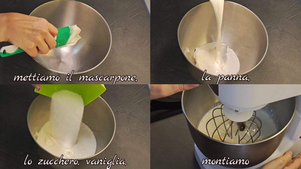 • Colocamos o mascarpone, o creme de leite, o açúcar e a baunilha, depois batemos com o batedor até obter um creme denso e homogêneo.