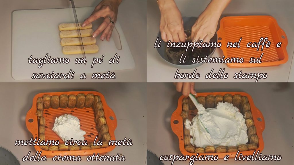 • Cortamos alguns biscoitos champanhe ao meio, depois os embebemos no café e açúcar e os colocamos alinhados na borda da forma. Adicionamos uma camada de creme (cerca de metade da quantidade obtida), espalhamos e nivelamos bem com uma espátula.
