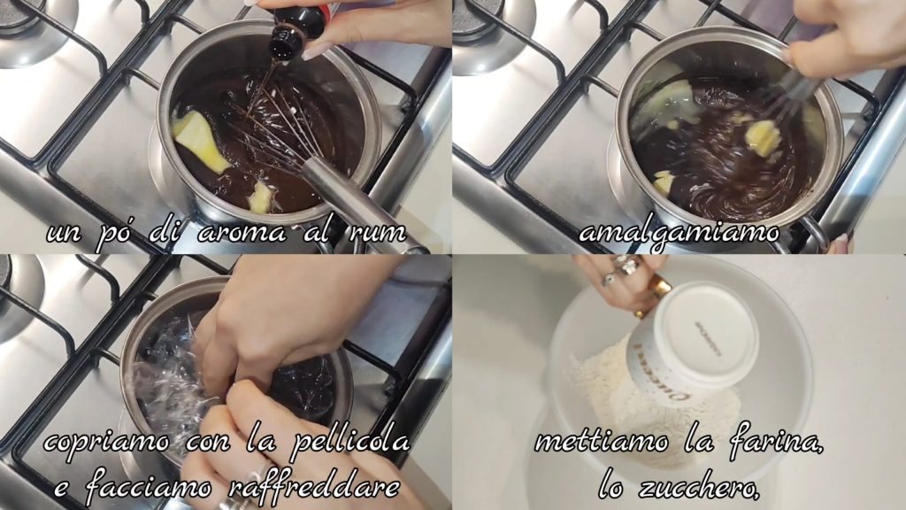 Adicionamos um pouco de aroma de rum, misturamos. Cobrimos com filme plástico e deixamos esfriar.