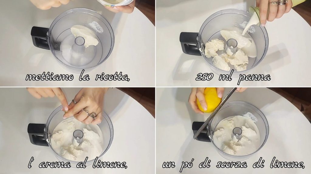 Preparação do creme: Colocamos a ricota, o creme de leite, aroma de limão e um pouco de raspas de limão.