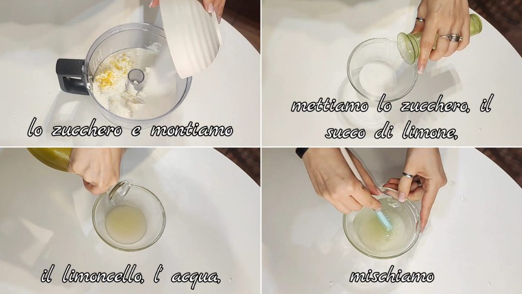 Adicionamos o açúcar e batemos até obter um creme denso e homogêneo. Preparação da calda: Em um recipiente, colocamos o açúcar, o suco de limão, o limoncello, a água e misturamos.