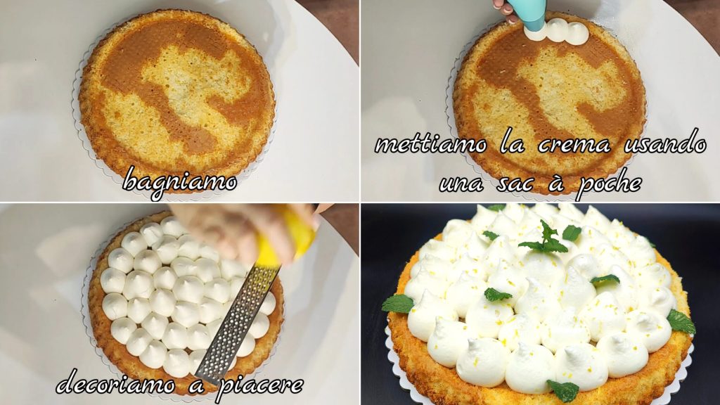 Montagem: Molhamos a base da torta com a mistura preparada. Colocamos o creme obtido por cima usando um saco de confeitar e depois decoramos a gosto com raspas de limão, folhinhas de hortelã ou outro. Colocamos na geladeira por algumas horas.