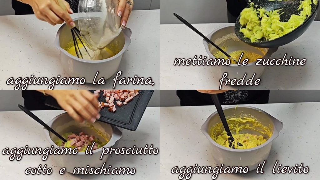 adicionamos a farinha, as abobrinhas frias, o presunto picado e misturamos. Por fim, adicionamos o fermento.