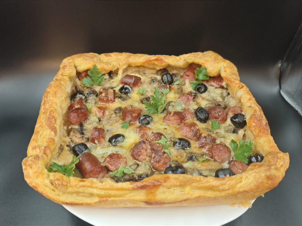 A preparação da torta salgada de massa folhada é muito simples e rápida, veja o vídeo AQUI.
