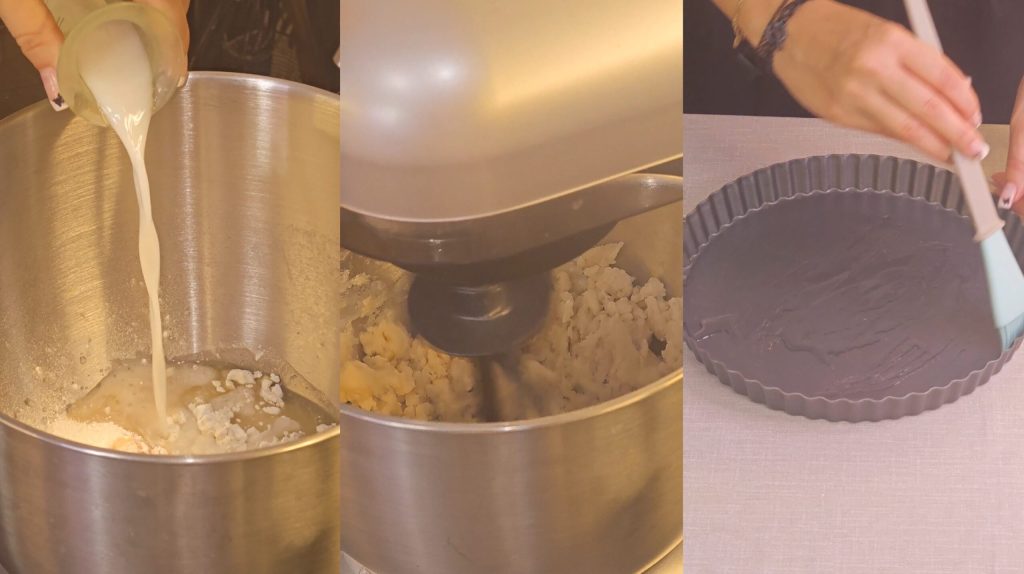 • Pegue a massa e divida em duas partes: use cerca de ¾ da massa para a base. Abra com o rolo sobre um papel manteiga e coloque na forma.