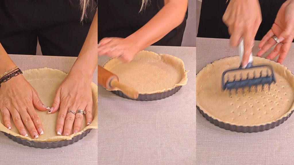 • Remova o excesso de massa das bordas. Fure o fundo com um garfo.