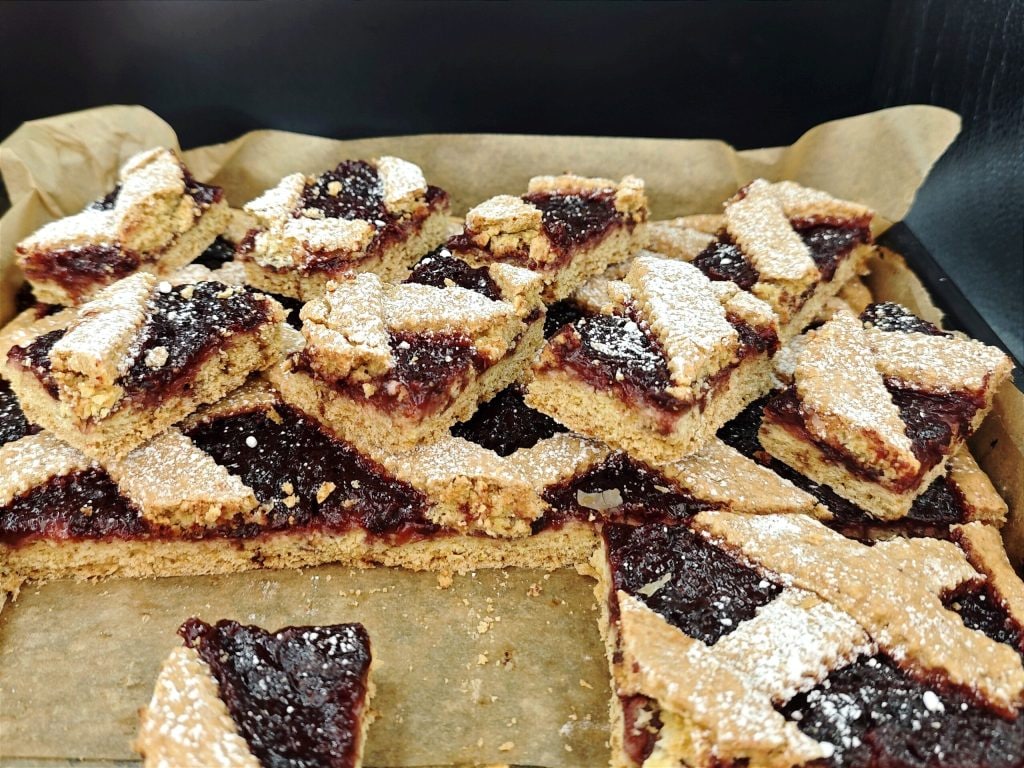 • Depois fazemos furos. Colocamos a geleia, espalhamos e nivelamos bem. Estendemos a massa restante.