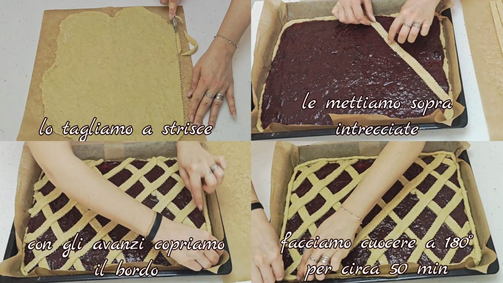 • Cortamos em tiras. Colocamos em cima entrelaçadas. Com as sobras fazemos cordões e os colocamos ao redor. Assamos a 180° por cerca de 50 minutos.