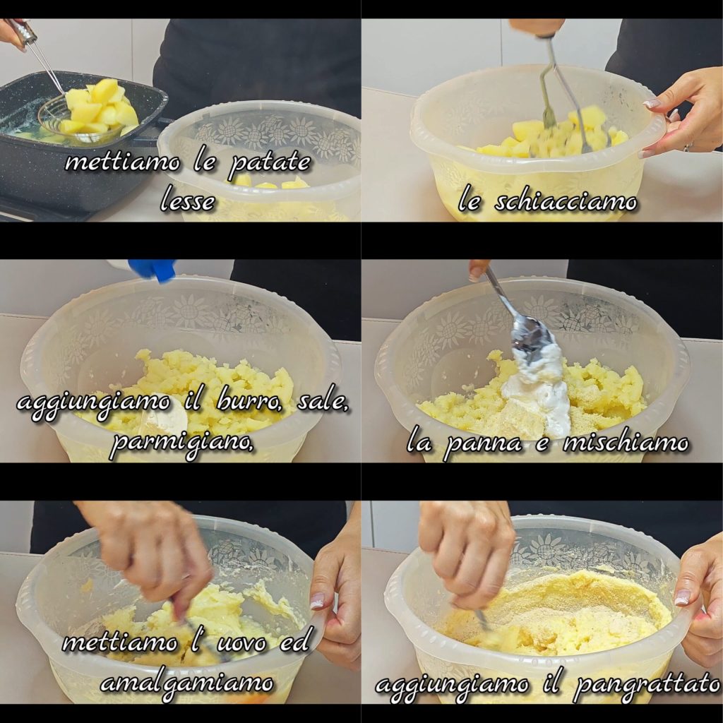 Em um recipiente, colocamos as batatas cozidas e escorridas e as amassamos. Adicionamos a manteiga, sal, parmesão, o creme de leite e misturamos. Colocamos o ovo e amalgamamos. Por fim, adicionamos a farinha de rosca.
