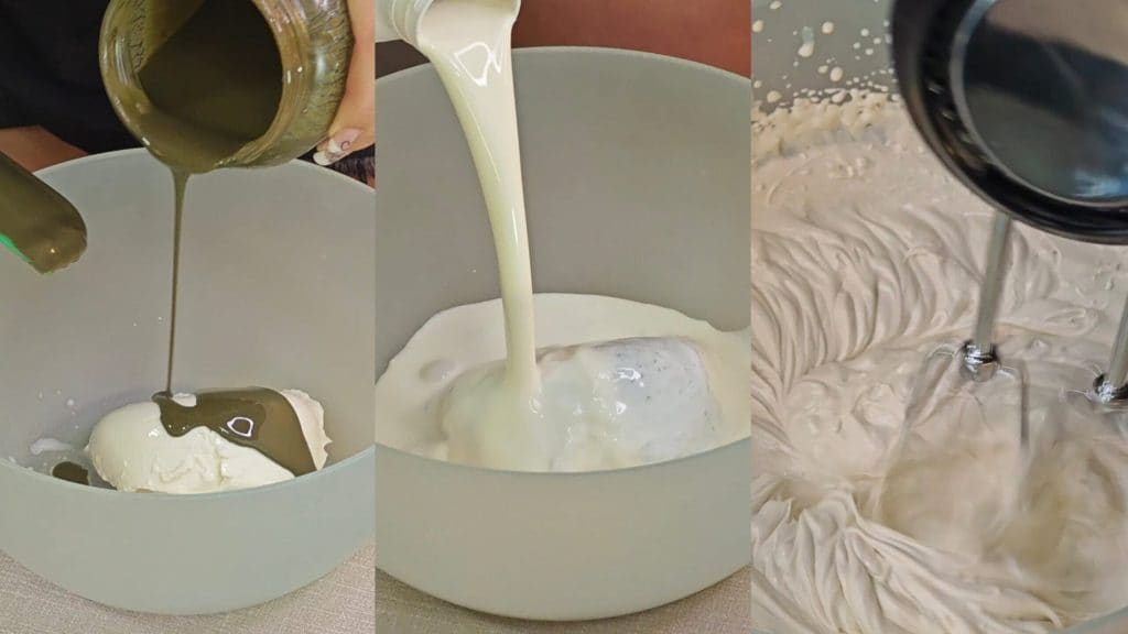 Coloque o mascarpone, a pasta de pistache, o açúcar, o creme de leite e bata com as varas até obter um creme denso e homogêneo.