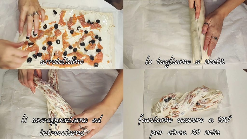 Enrolamos ajudando-nos com o papel manteiga. Se quiser cortar melhor o rolo, pode colocá-lo no freezer por cerca de 30/50 min (eu estava com pressa e não fiz isso), caso contrário, pode fazer como eu, ou seja, cortamos imediatamente ao meio (no comprimento). Sobrepomos as duas partes e as trançamos entre si. Cozinhamos a trança a 180° por cerca de 30 min.