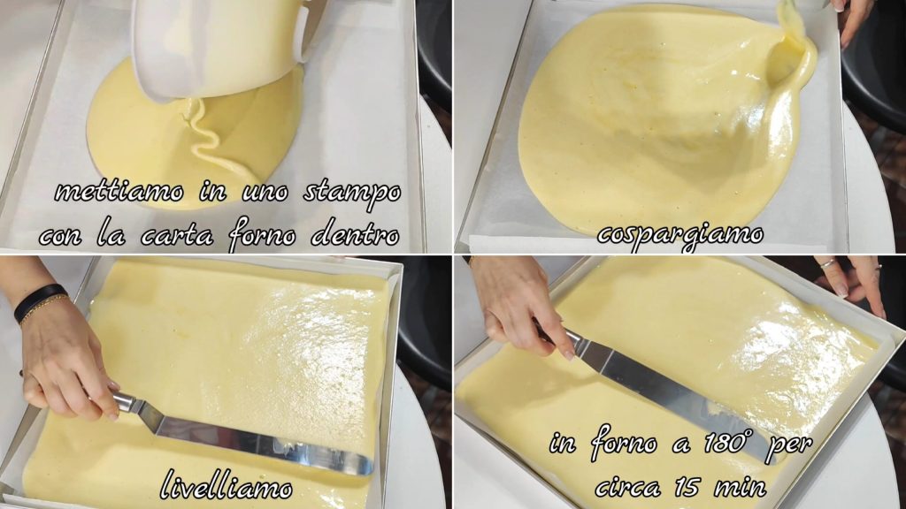 Coloque a mistura obtida em uma assadeira forrada com papel manteiga, espalhe a mistura por toda a superfície. Nivele e bata levemente. Asse a 180°C por cerca de 15 min.