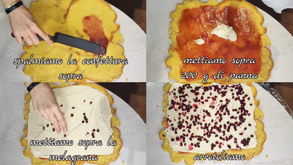 Espalhamos a geleia por cima usando uma espátula. Adicionamos o creme de leite por cima e depois colocamos as sementes de romã. Enrolamos com a ajuda do filme plástico.