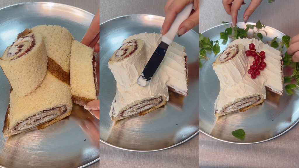 Coloque o rolo no prato de servir, adicione as duas fatias nas laterais para criar o efeito tronco. Cubra com o creme restante e decore a gosto (açúcar de confeiteiro, frutas vermelhas, coco ralado, granulados, etc.).