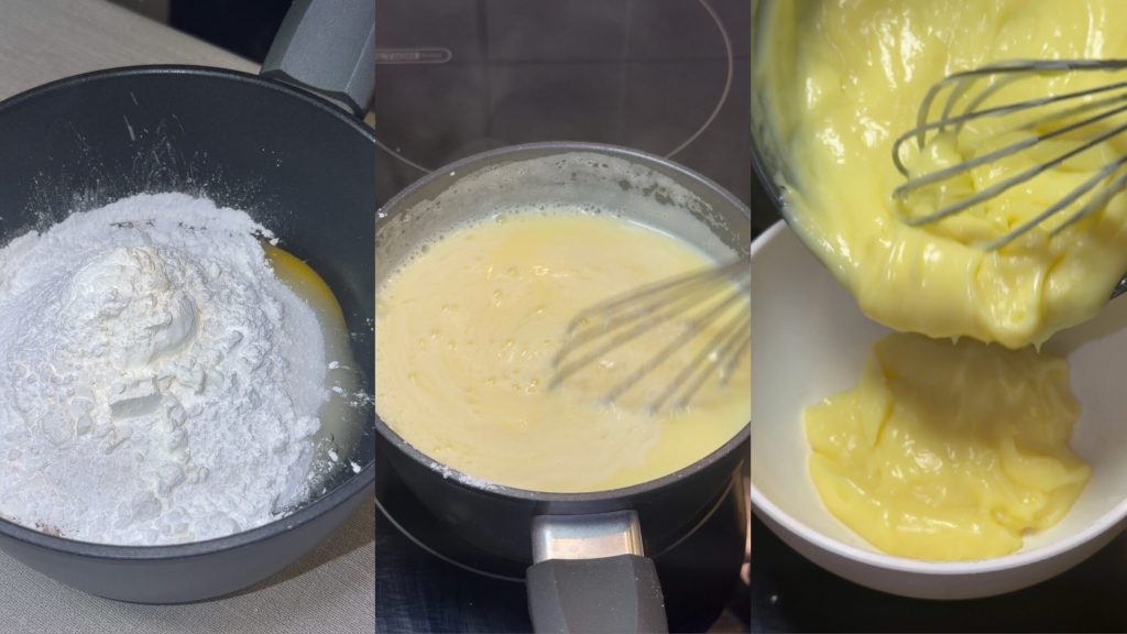 • Em uma tigela, bata as gemas com o açúcar e o amido até obter uma mistura clara. Adicione o leite, a casca de limão e leve ao fogo para engrossar, mexendo sempre.