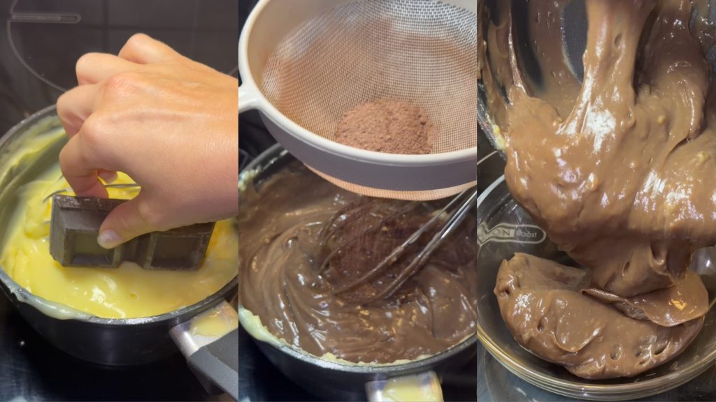• Na metade restante, ainda quente, adicione o chocolate amargo (e o cacau, se desejar um sabor mais intenso). Misture até obter um creme liso e homogêneo.