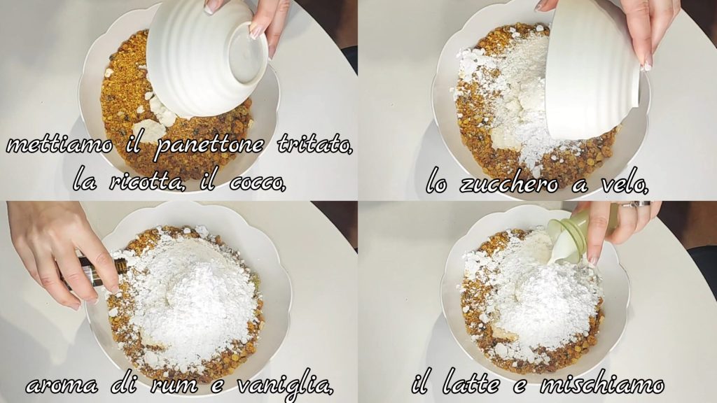 Primeiro, trituramos o panetone ou as sobras usando o processador. Adicionamos a ricota bem escorrida, o coco ralado, o açúcar de confeiteiro, um pouco de aroma de baunilha e de rum, o leite e misturamos bem até obter uma mistura homogênea.