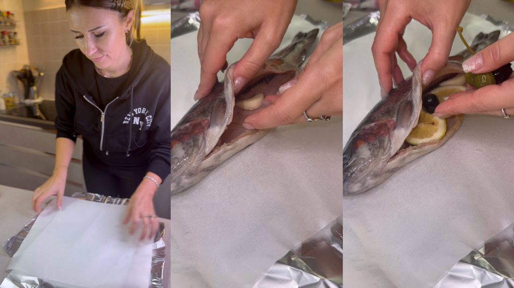Limpe e enxágue bem a truta salmonada, depois seque-a com papel toalha. Coloque-a em uma folha de papel manteiga. Insira fatias de limão, dentes de alho, alcaparras, azeitonas e alecrim.
