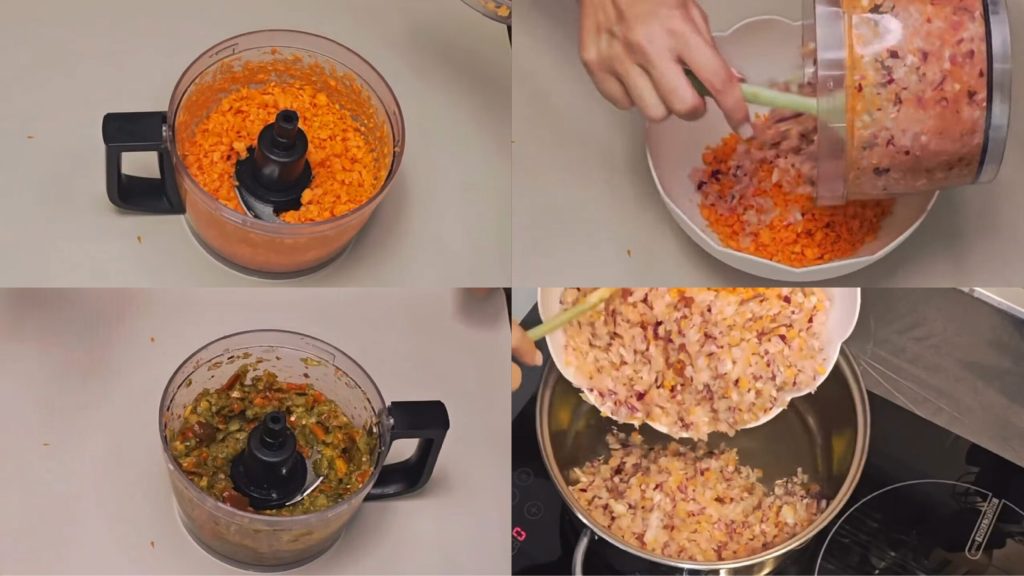 • Primeiro prepare todos os vegetais: pique finamente as cenouras, as cebolas e os pimentões assados e descascados. Você pode fazer isso à mão ou com um processador de alimentos, assim mantém uma consistência ligeiramente rústica, como na receita tradicional. Em uma panela grande, despeje o óleo e, quando estiver quente, adicione a cebola e as cenouras. Deixe refogar suavemente por cerca de dez minutos, até que a cebola fique transparente e libere seu aroma.