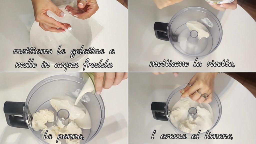 Primeiro, coloque a gelatina para hidratar em água fria por cerca de 10 min. Prepare o creme. Coloque a ricotta, o creme de leite e o aroma de limão.
