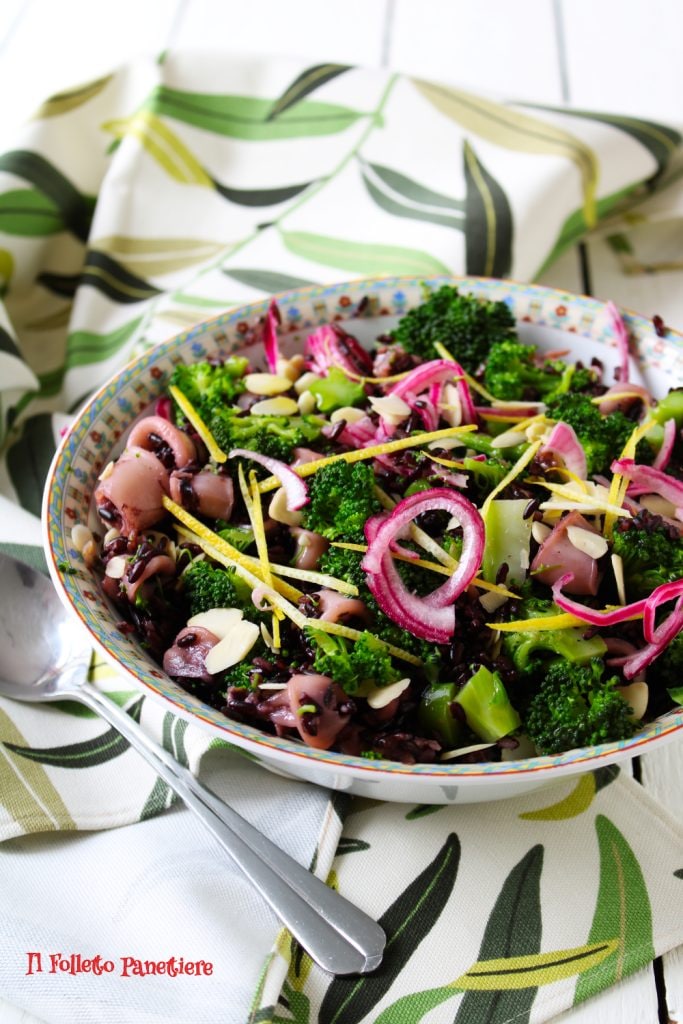 Adoro o arroz negro, e este com lulas e brócolis é um prato principal de sabor realmente surpreendente e é uma receita muito versátil. Bom tanto morno quanto frio, pode ser uma ótima ideia também como refeição para levar fora agora que as temperaturas primaveris convidam para os primeiros passeios ao ar livre.
