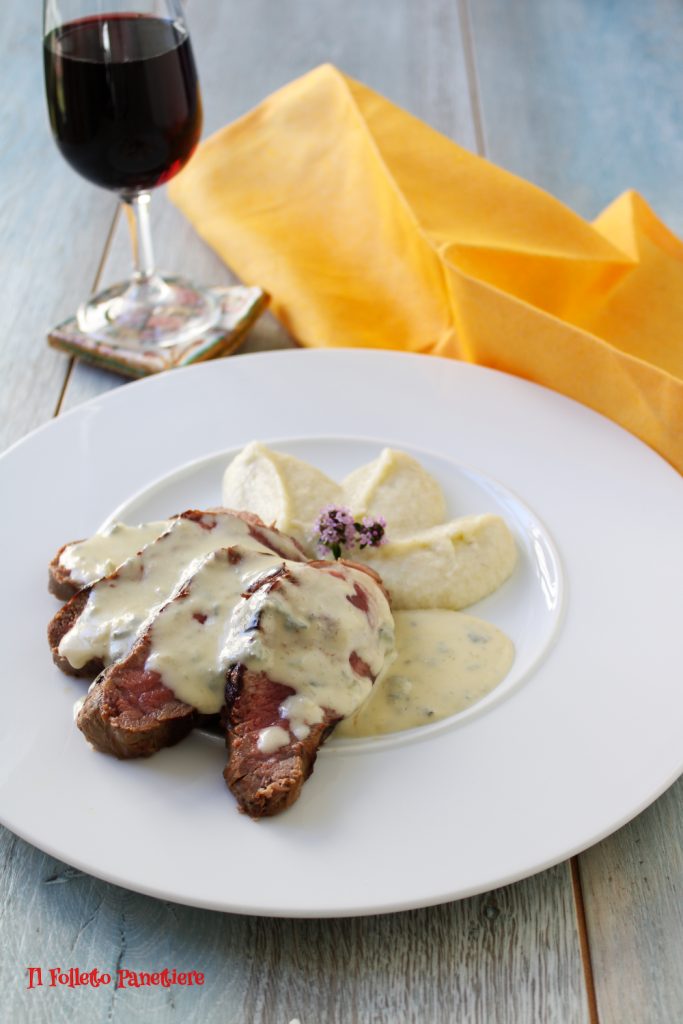 Filé de carne ao Blu do Moncenisio com purê de erva-doce e aipo-rábano à lavanda