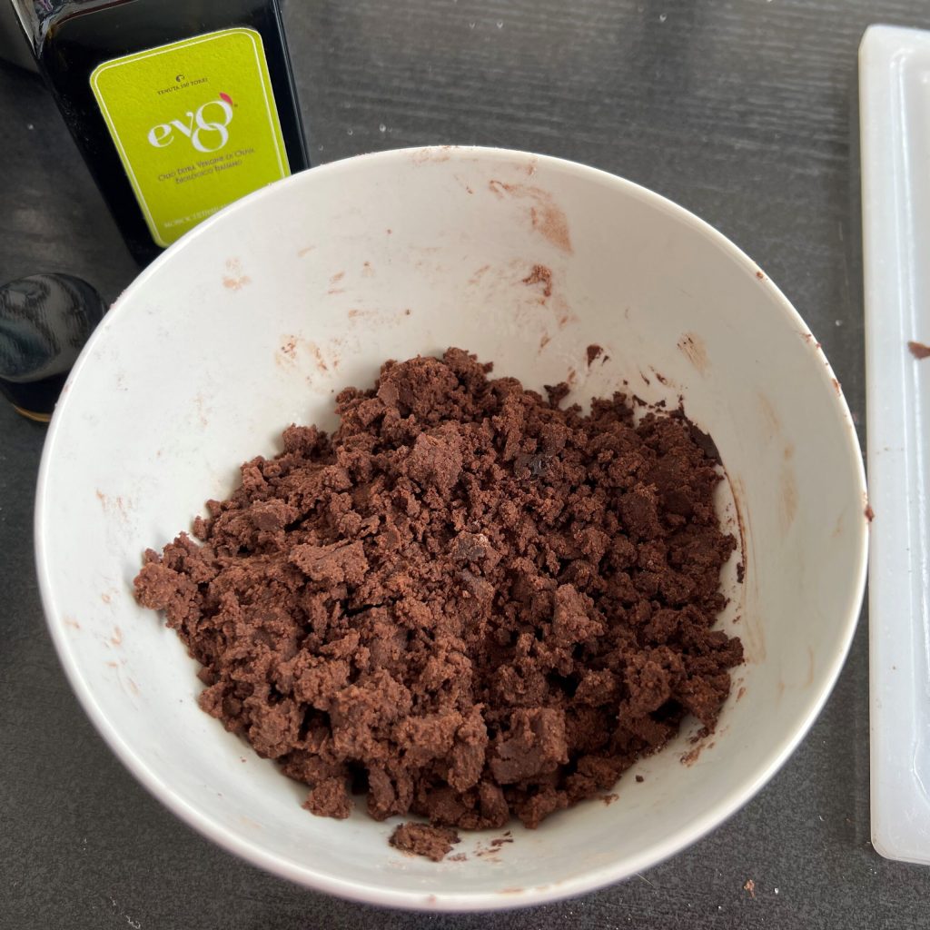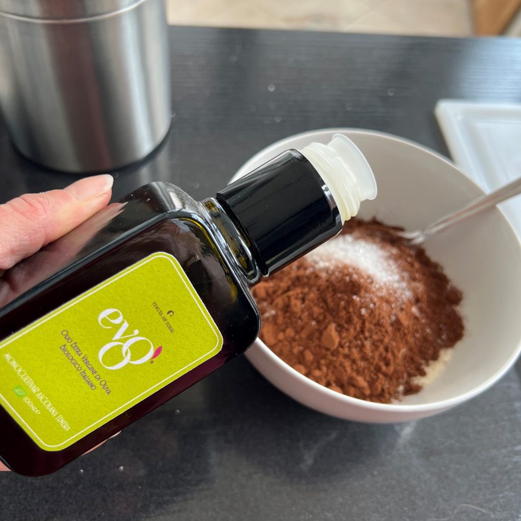 • Em uma tigela, misture a farinha com o açúcar e o cacau. Adicione 2 colheres de sopa de azeite EVO e uma pitada de sal