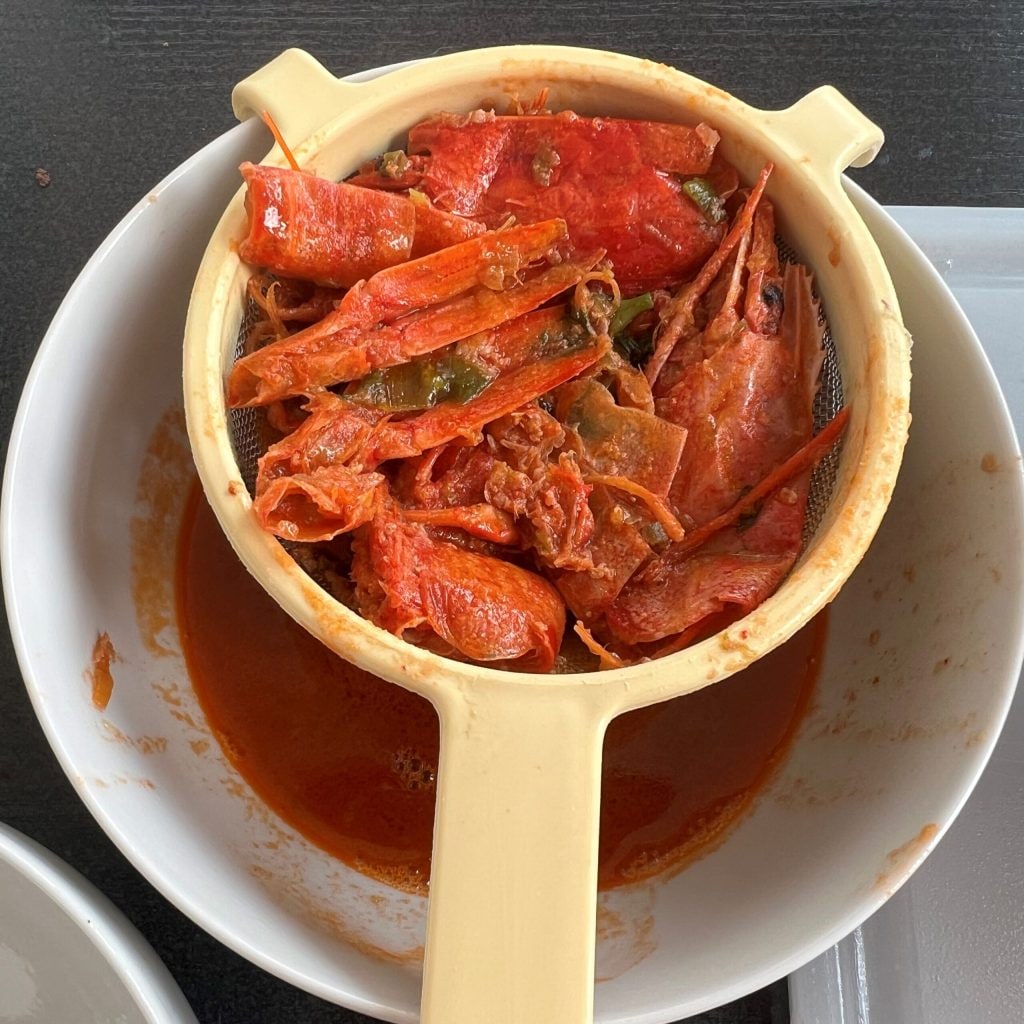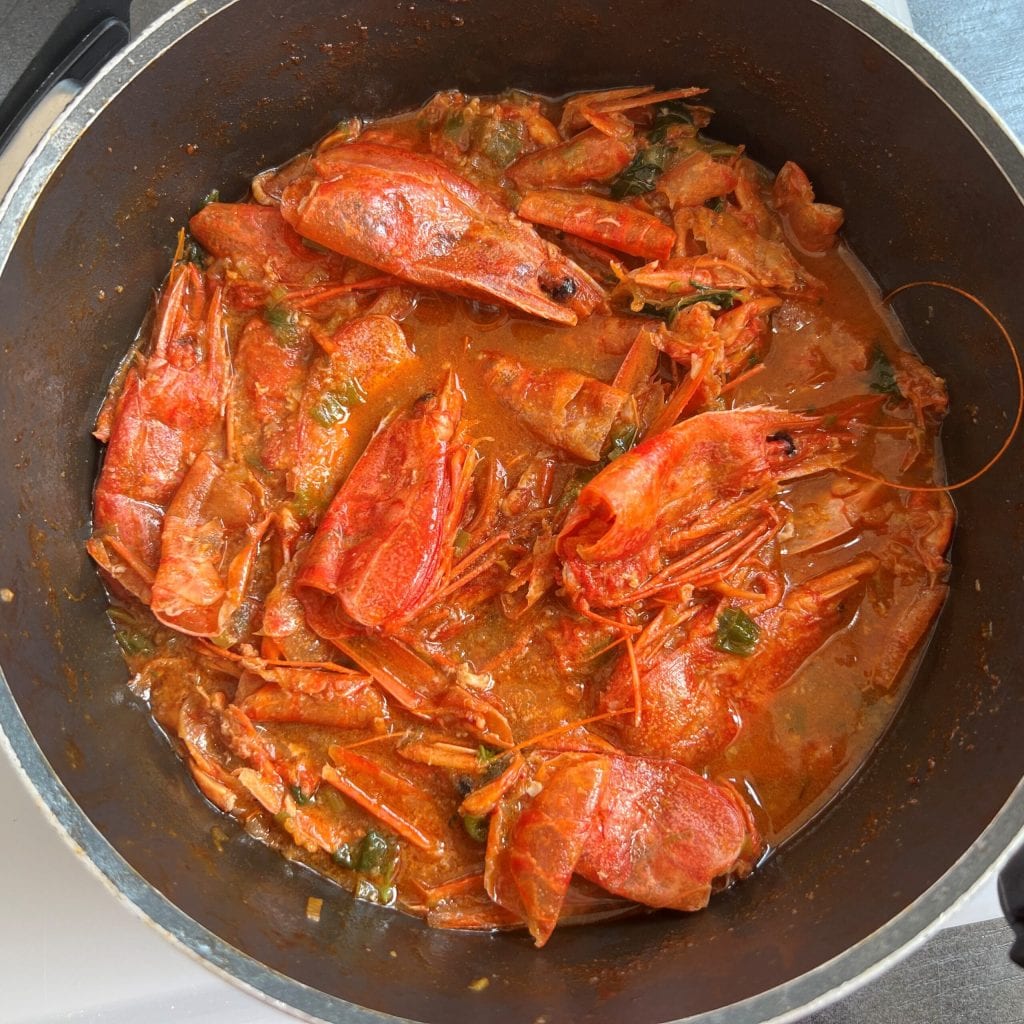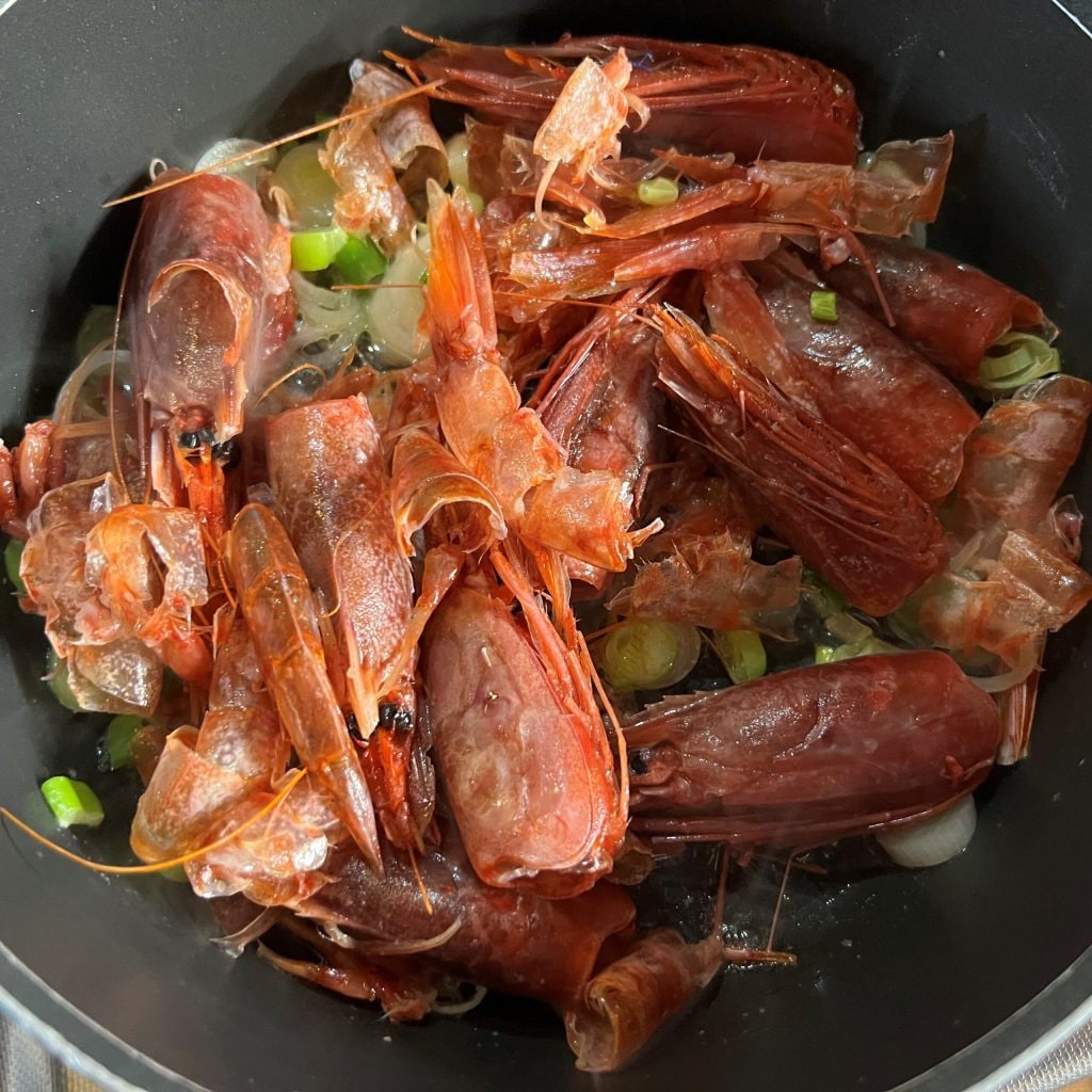 • Coe bem tudo, pressionando em uma peneira as cabeças e as cascas dos camarões