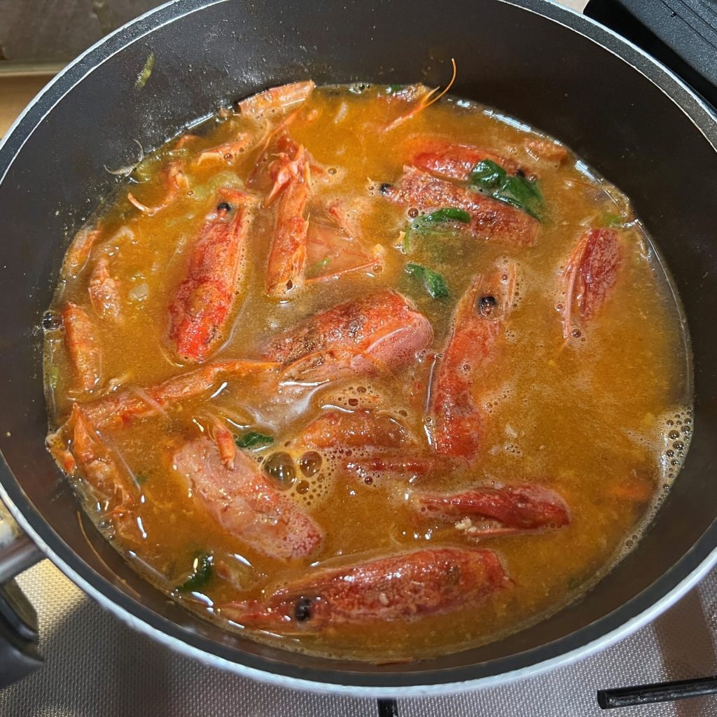 • Adicione as cabeças e as carapaças dos camarões e refogue bem, esmagando-os com uma colher de pau para liberar os sucos. Adicione o concentrado de tomate e deglaceie com o vinho branco e o Marsala